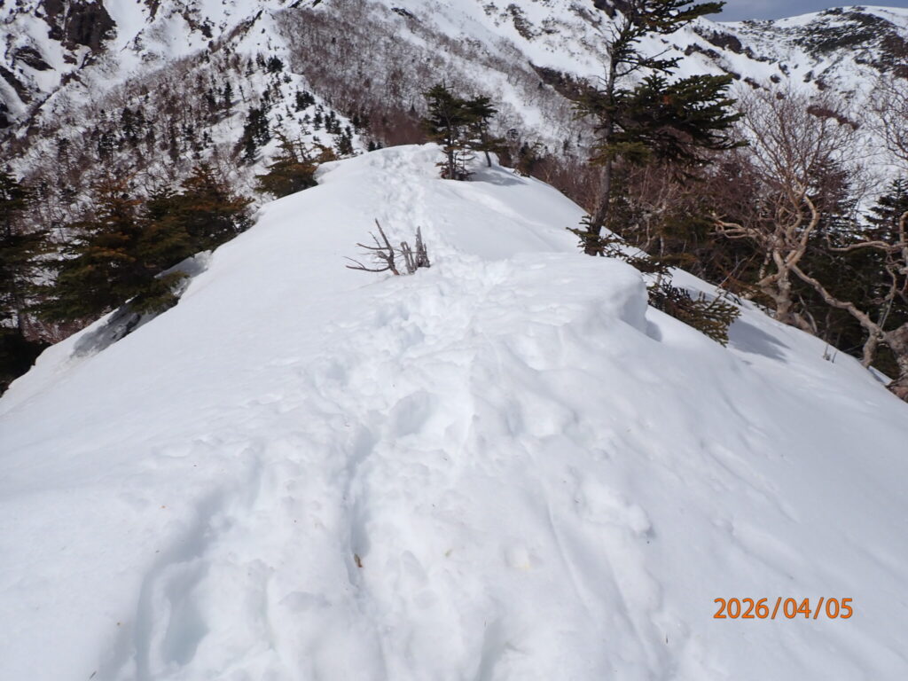この時点でアイゼンに変えて歩行負荷が変わると足にどのような影響が出るかわからないのでこの場所ならこのまま下れると判断。感覚が戻ったところで下り始めました。