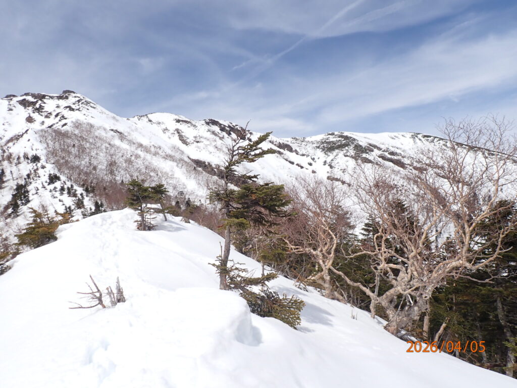 気温が高くR1フーディはすぐに脱ぎました。手袋もベースは不要で濡れないようにアクシスクイン防水のみ。樹林帯の凍結氷がつるつるですぐにチェンスパを装着。2200mからの雪は湿っていてトレースも消えかかっていました。