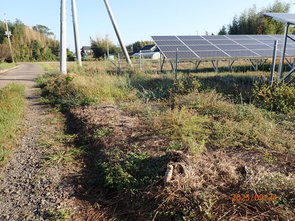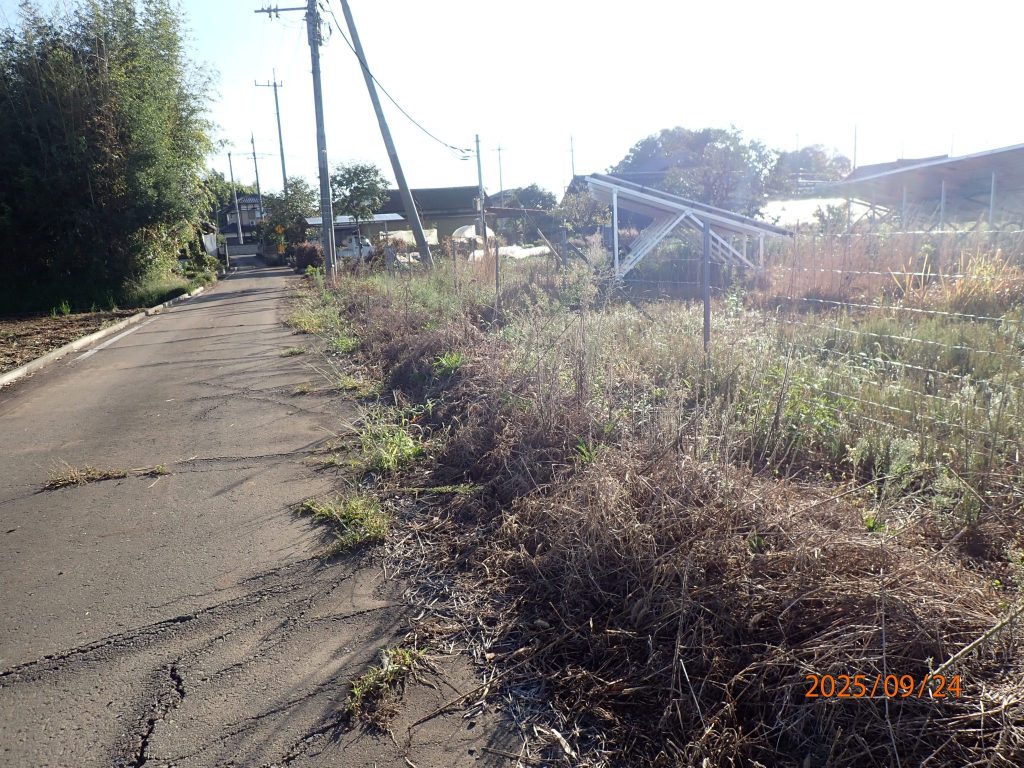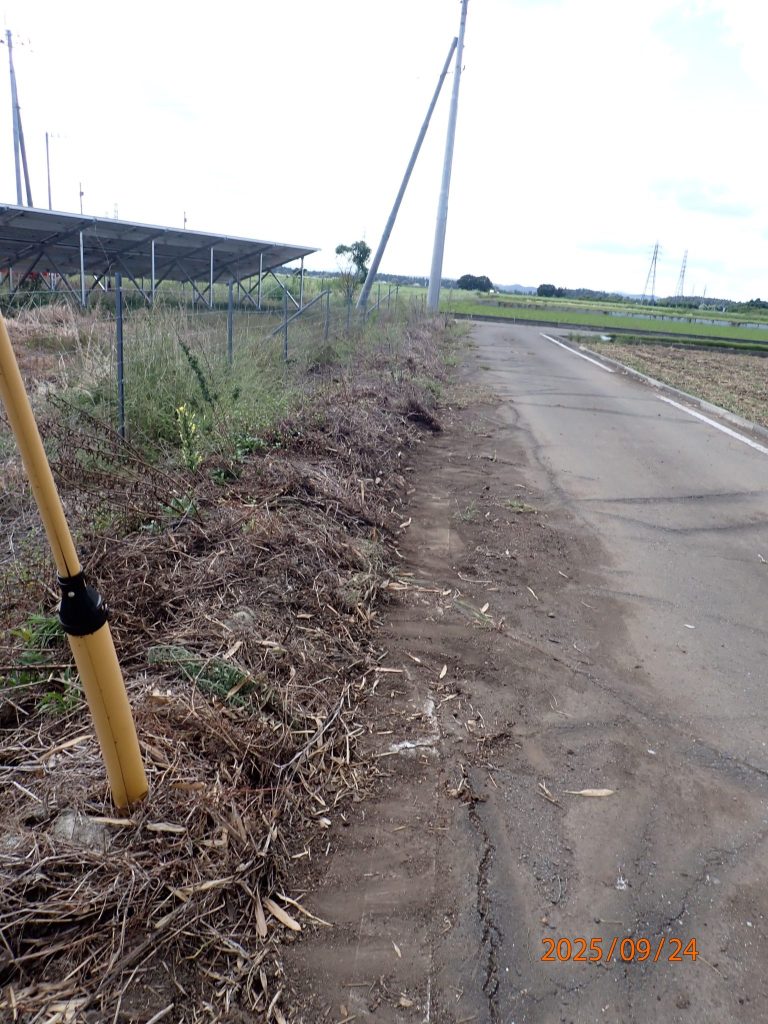 草刈りと除草剤散布をしました。前回7/20から2か月で結構伸びていますが許容範囲だと思います。右下の写真でだいぶ白線から土が道路側に出ているのでこれも白線内に移します。