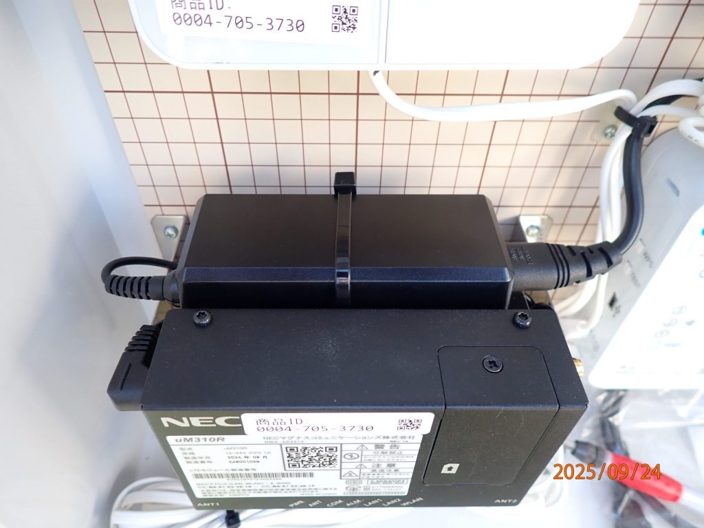 ルータの疎通試験を行うので時間がどれぐらいかかるかわかりません。このため最初にエコめがねのルータを交換します。分電盤のブレーカーを落として作業します。左上写真がは分電盤です。この一番下にエコめがね用の専用ブレーカーがありそれを切ります。右上写真がエコめがねのセットです。左下が交換した4Gモデムアッセンブリで黒い塊ごと交換しました。右下写真が交換後の写真です。