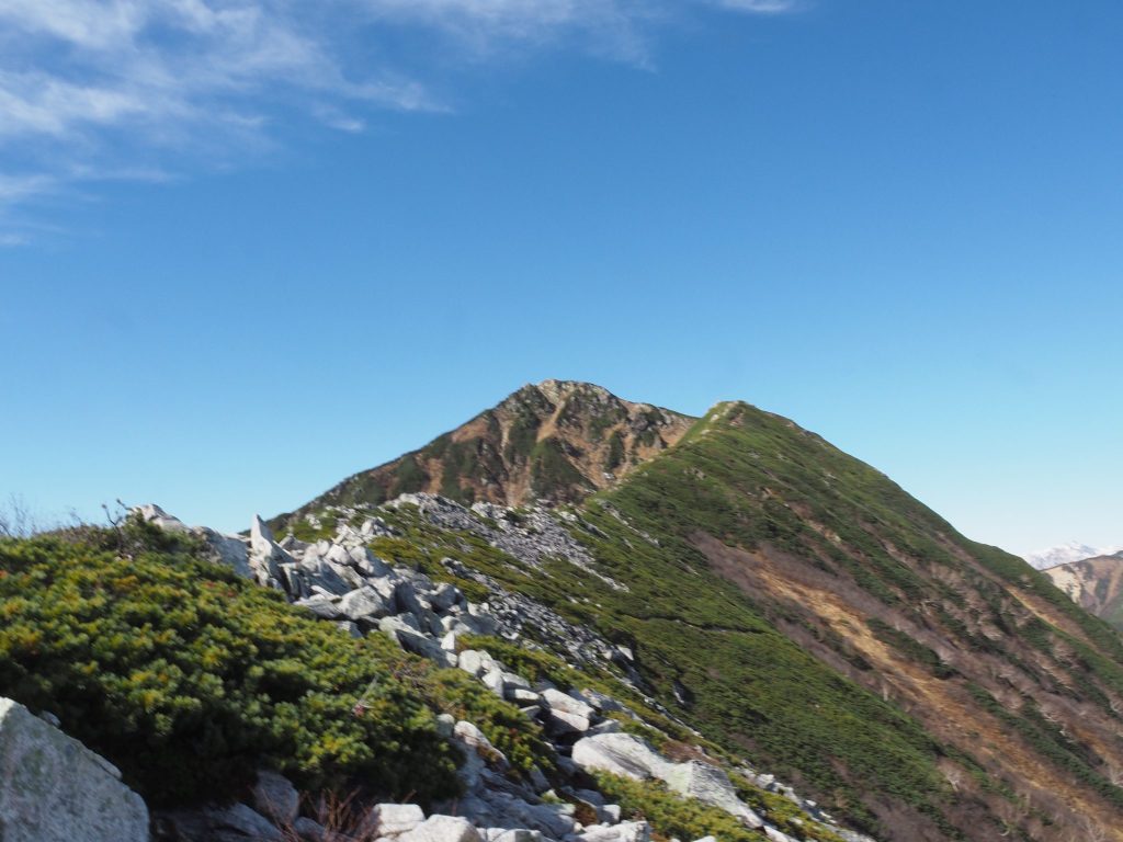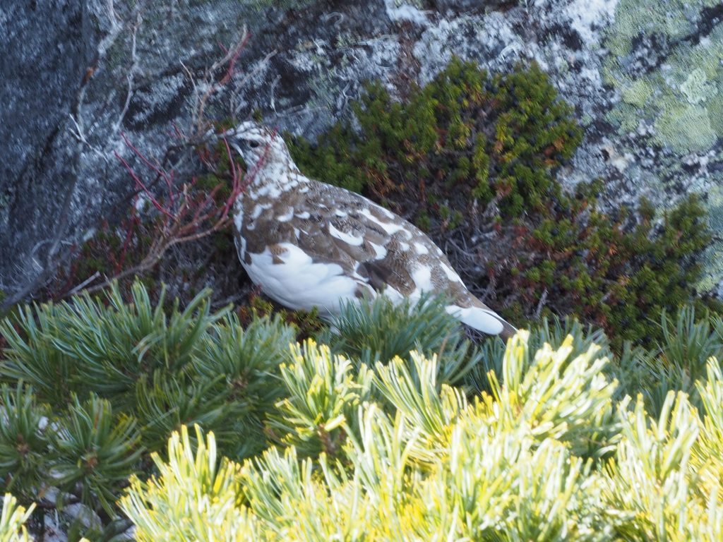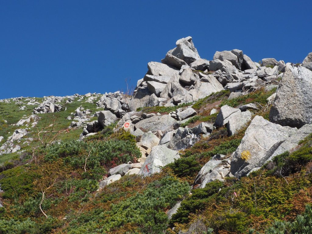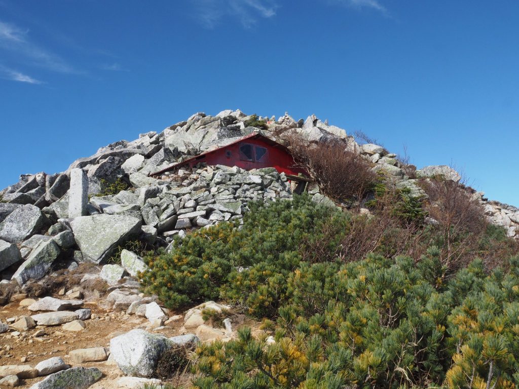 岩稜帯にはいると、避難小屋が出てきます。ここを超えると前常念のピーク、そこで雷鳥がいると教えてもらえたので撮影できました。
