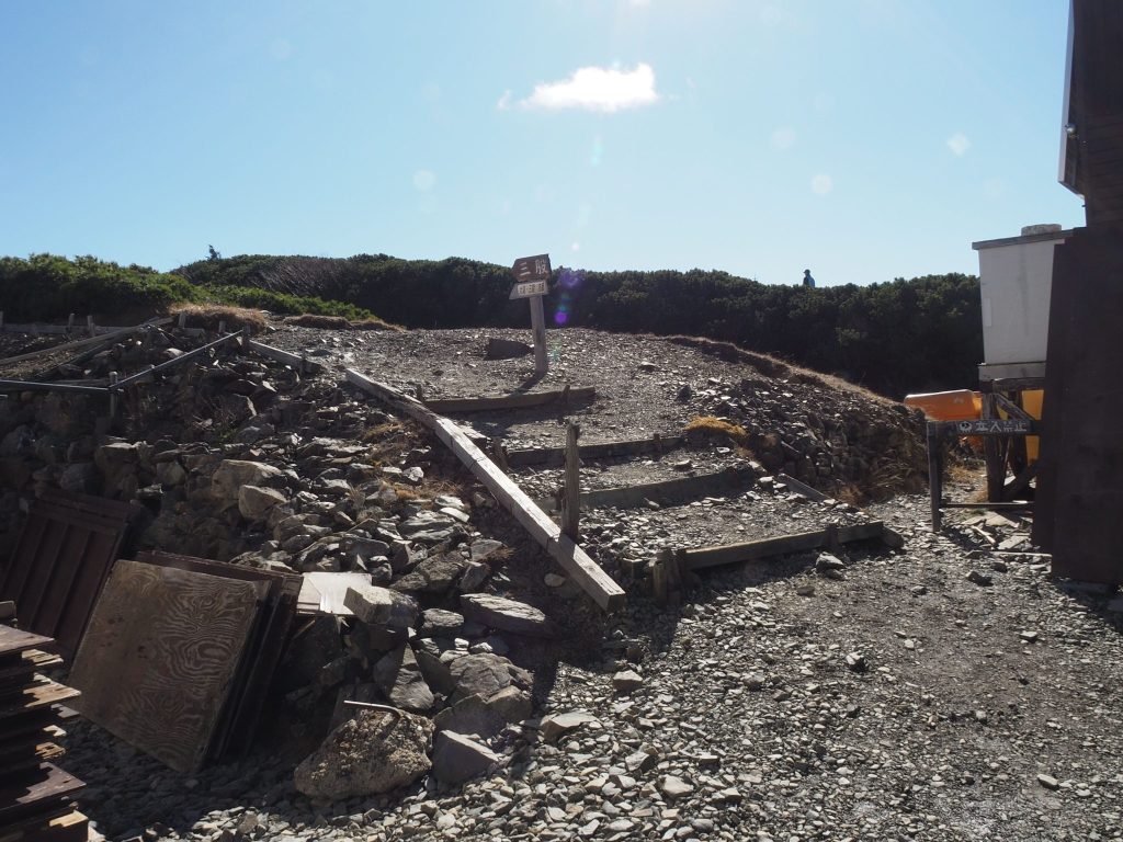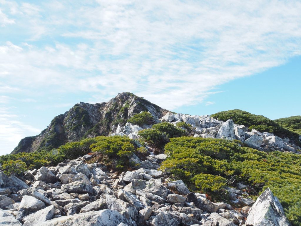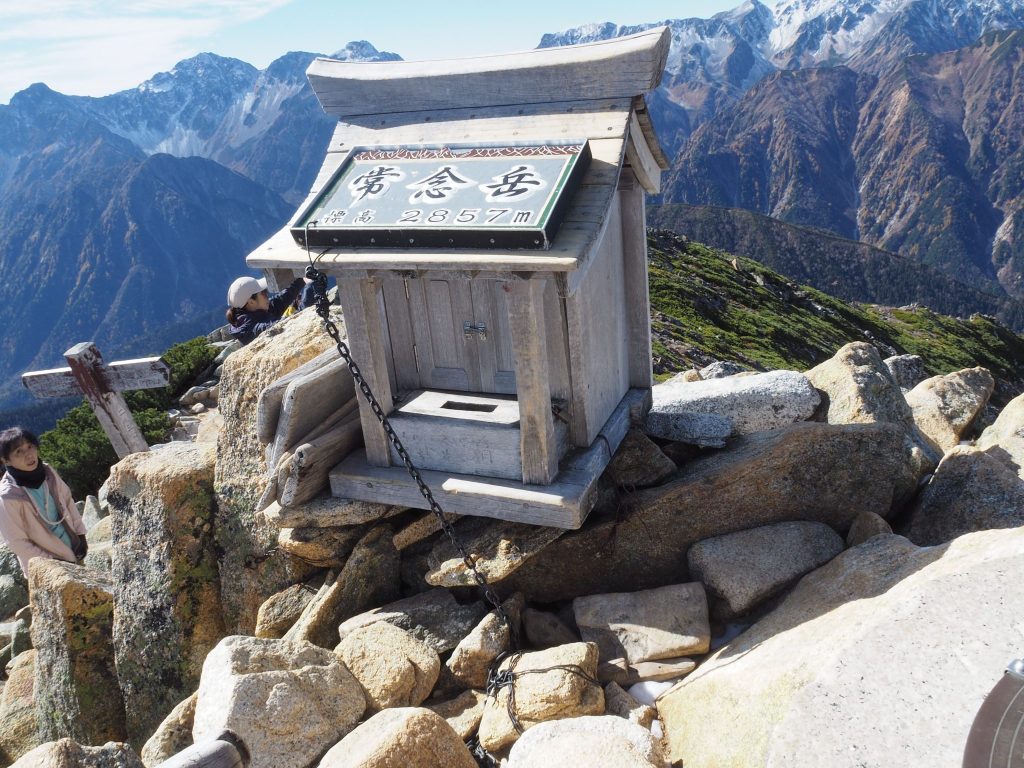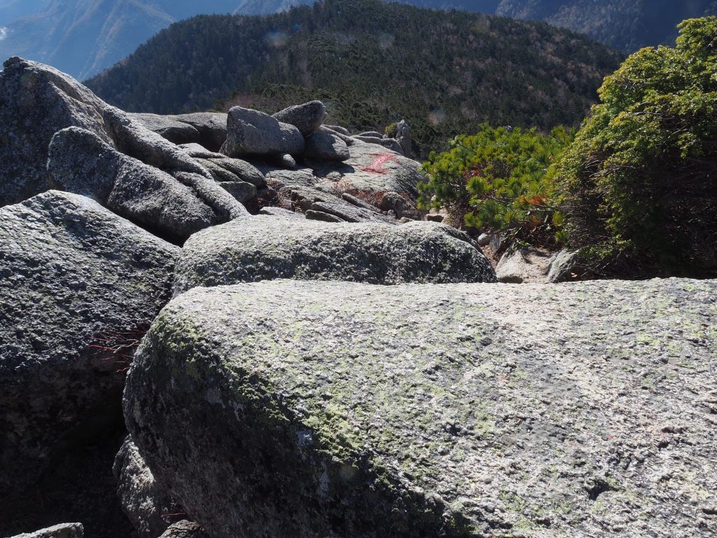 岩稜帯にはいると、避難小屋が出てきます。ここを超えると前常念のピーク、そこで雷鳥がいると教えてもらえたので撮影できました。