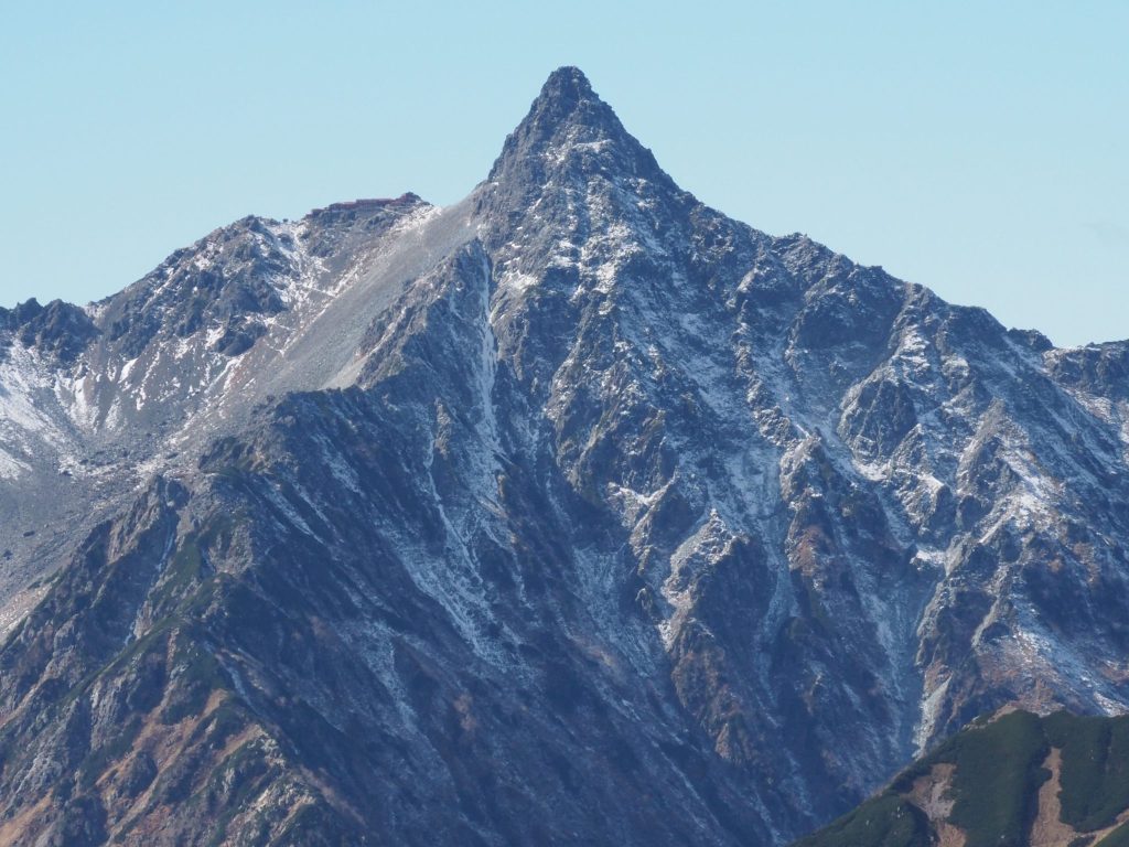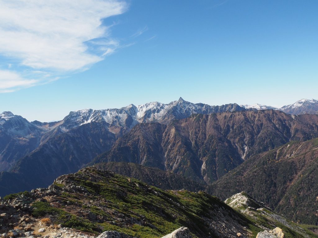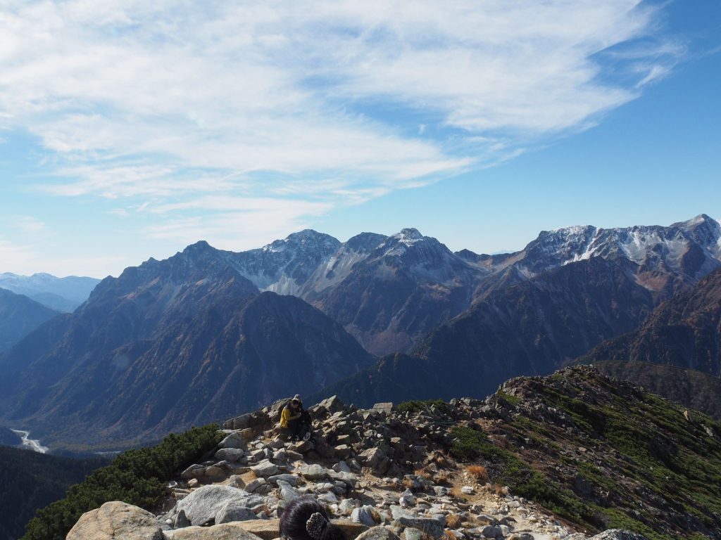 好天に恵まれて周囲は絶景でした。穂高連峰に槍ヶ岳、上高地ははるか下界、槍ヶ岳のアップです。