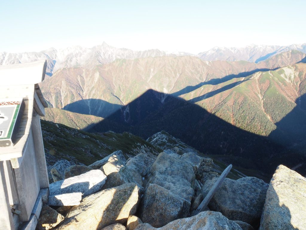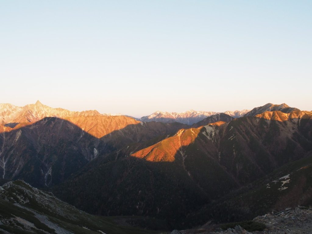 翌朝、4時15分に小屋を出発。頂上で夜明けはどうか。全然間に合いませんでした。同じぐらいに出た女性の方は余裕で間に合っていましたが私は3時間かかりました。上っところには常念岳の影がくっきりと。