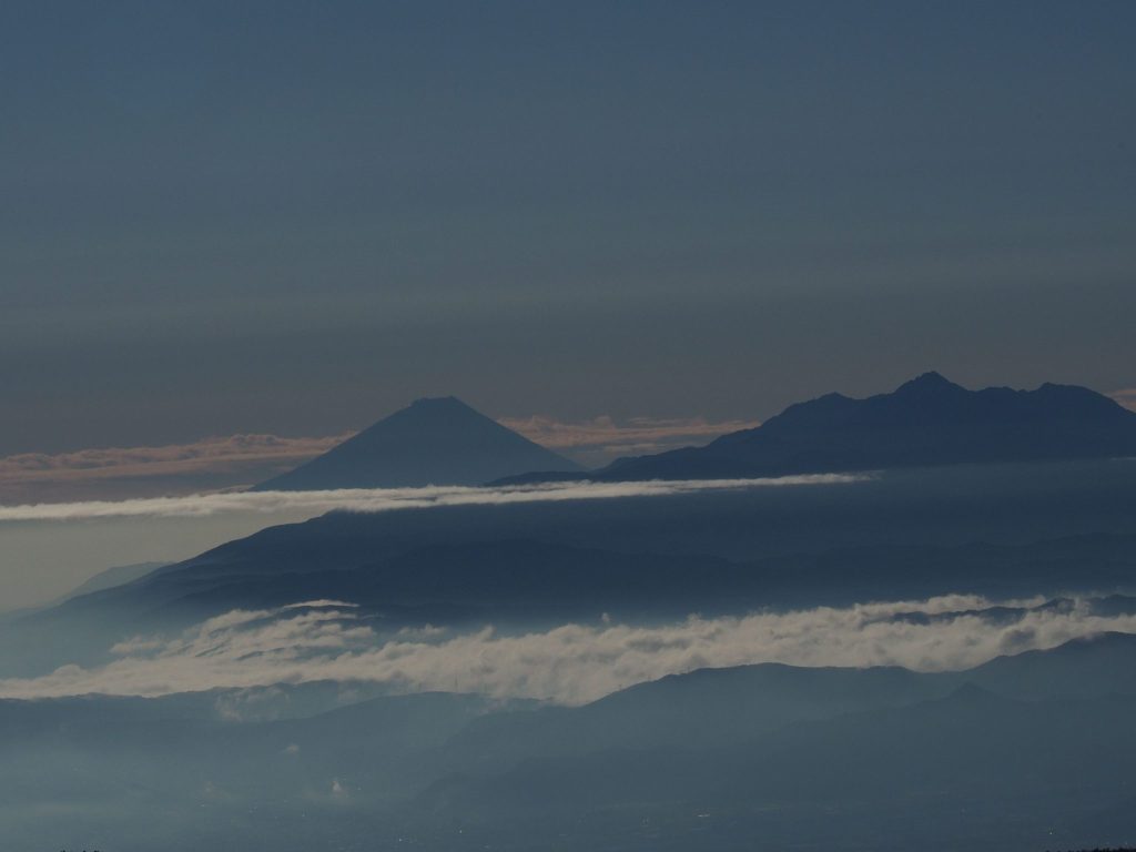 ここから蝶ヶ岳側に縦走です。結構下ります。途中の富士山。