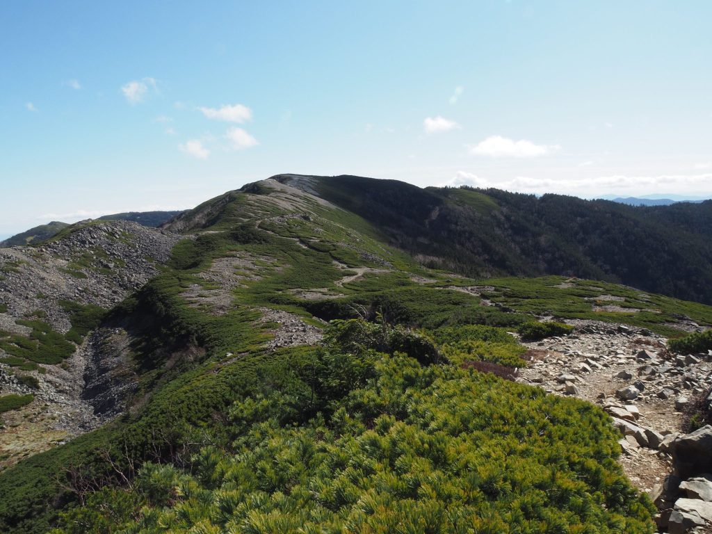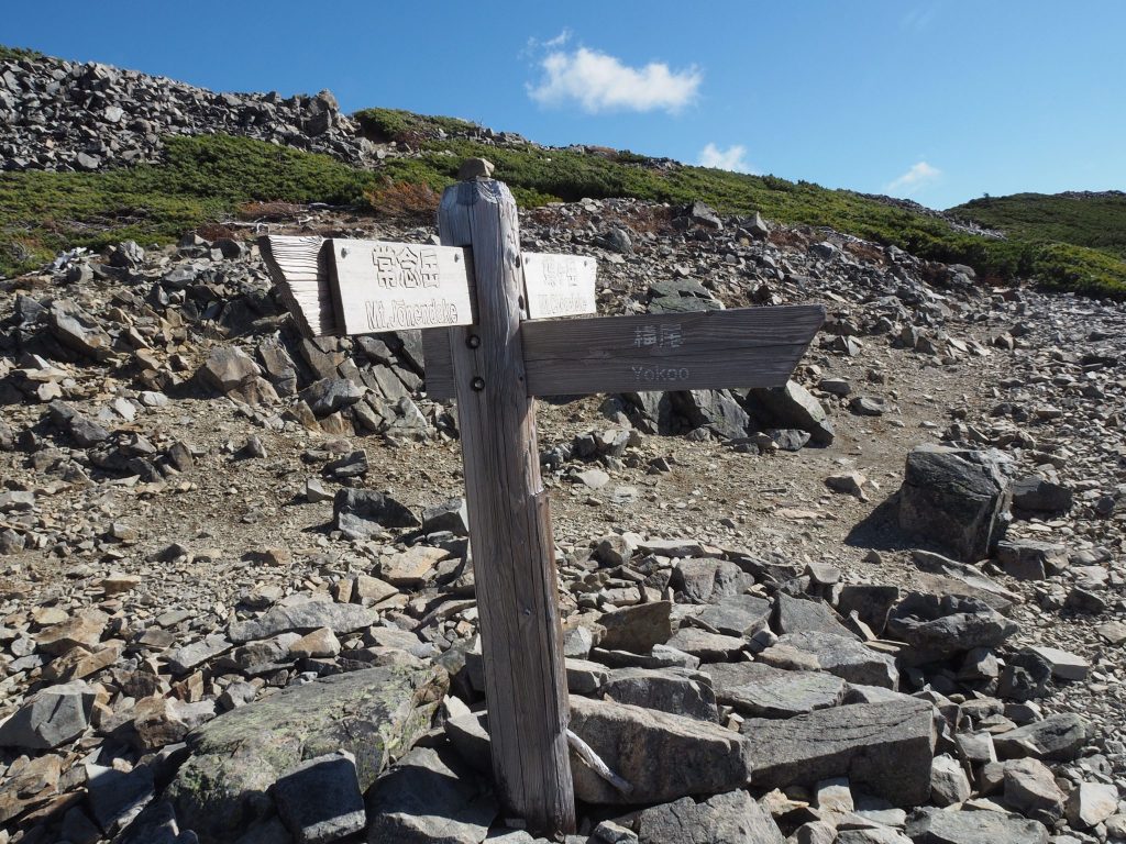 上り下りはありますが最後の蝶槍の登り返しを見上げて上る。そこを過ぎると、上高地の横尾からの分岐に出てくる。その先にまだ蝶ヶ岳は遠い。