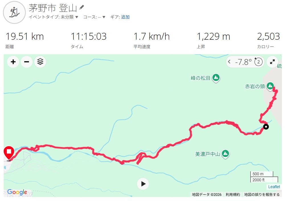 歩行履歴は下記です。往路でトレースを見誤ってルートを外れてしまいスマホのマップで歩行しました。トレースなし歩行は大変で、川沿いの斜面をトラバースする羽目になりましたが、倍以上時間がかかり汗だくになり、赤岳鉱泉直前でルート復帰しました。紙の地図を持ってはいますが自力でのルート確定は無理です。スマホ、予備電池必須です。